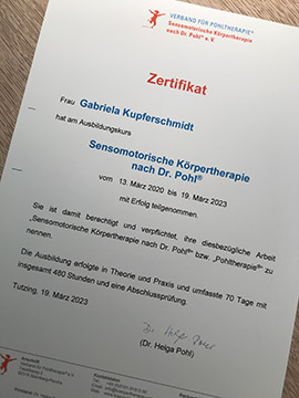 Während meiner Ausbildung habe ich das Erlernte mit Übungspatientinnen und -patienten laufend vertieft, seit März 2022 war ich befugt, als Pohltherapeutin in Ausbildung zu praktizieren. Im März 2023 habe ich meine Ausbildung abgeschlossen und nach einer umfassenden Prüfung in Theorie und Praxis mein Zertifikat erhalten.